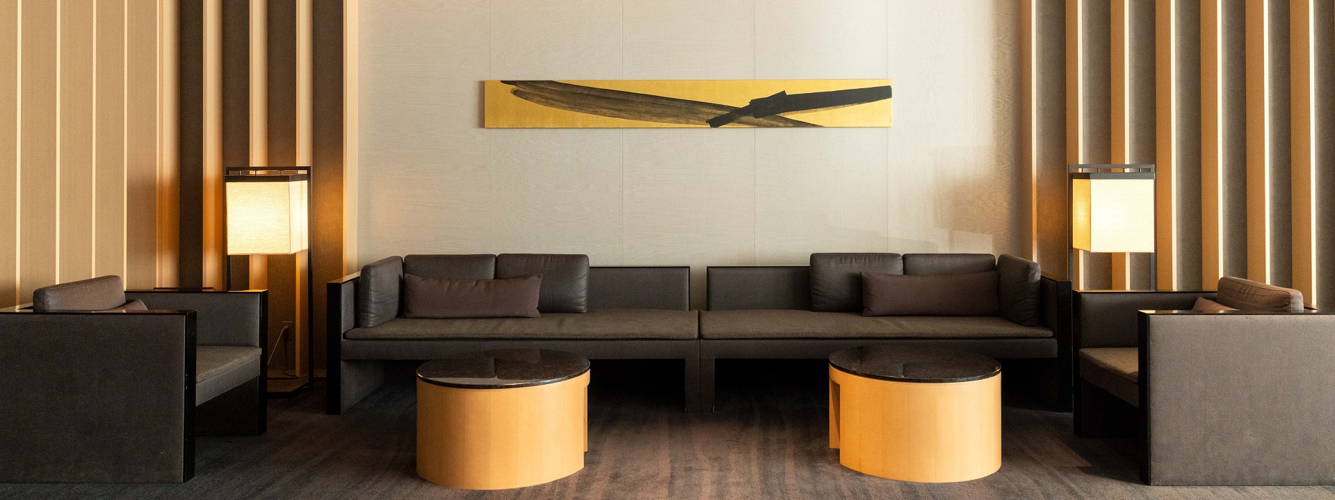 レセプション向かいには、旧ホテルでスイートルームに飾られていた、水墨抽象絵画の第一人者である女流作家篠田桃紅氏の作品「無題」、そして対面のレセプション 背面に飾られた、ホテル建て替えに伴い篠田氏が新たに描いた作品「豊」。相対する2つの作品は新旧のホテルをつなぐ象徴となりお客さまをお迎えしております。