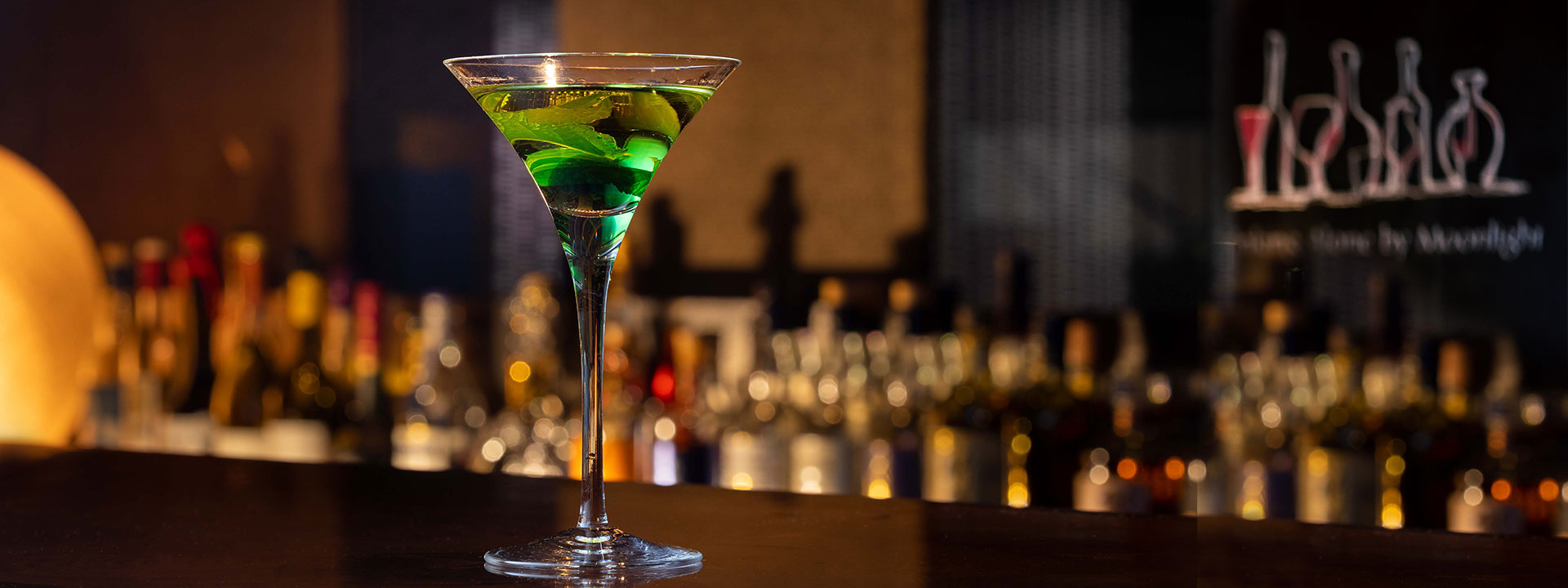 鮮やかなグリーンが美しい「水蓮」はラウンジ席からのぞむ水庭に浮かぶ蓮の葉からインスピレーションを受け完成しました。ジャパニーズウイスキーをベースに爽やかなマスカットのリキュールを合わせ、美しいグラデーションを演出。