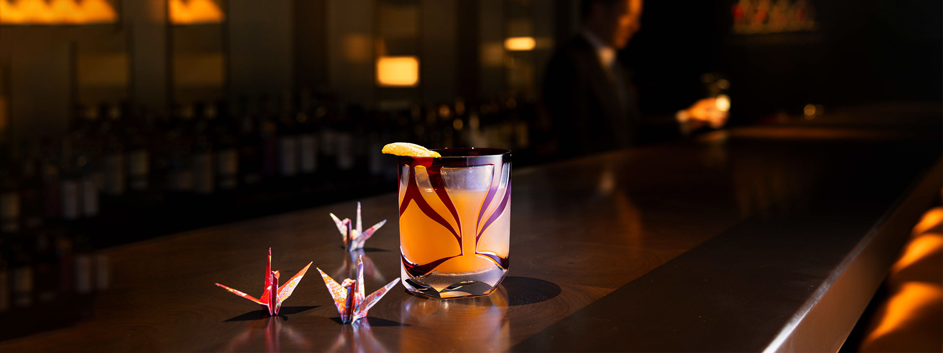 歌舞伎の隈取を施した江戸切子のグラスが目を引く「折り紙」はジャパニーズクラフトジンと国産のみかんジュースを合わせました。ベースとなるジンの切れのある味わいの中に、柑橘の甘く華やかな香りが広がります。和の風情漂う一杯をお楽しみください。