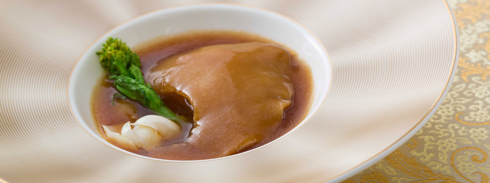ヨシキリザメの尾びれを使用した「ふかひれの姿煮」を2枚ご用意いたしました。姿煮の決め手はスープともいわれています。星ヶ岡では鶏肉と豚肉をベースに長時間強火で煮込んだコクのある白湯スープに、醤油、オイスターソース、葱油を入れたとろみのあるスープをふかひれと一緒に煮込み上質な味わいに仕上げました。