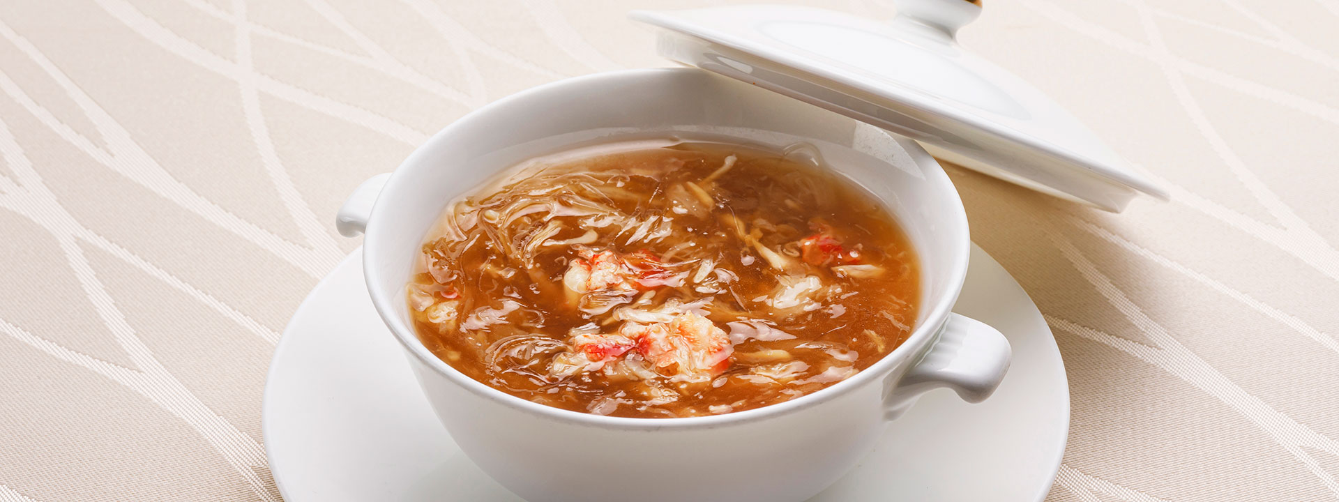 ほぐしたふかひれと上質なズワイ蟹を使用した旨味たっぷりのスープに仕上げました。鶏肉と豚肉から取った上湯スープに醤油とオイスターソース、紹興酒で味付けした上品な一品をどうぞご賞味ください。