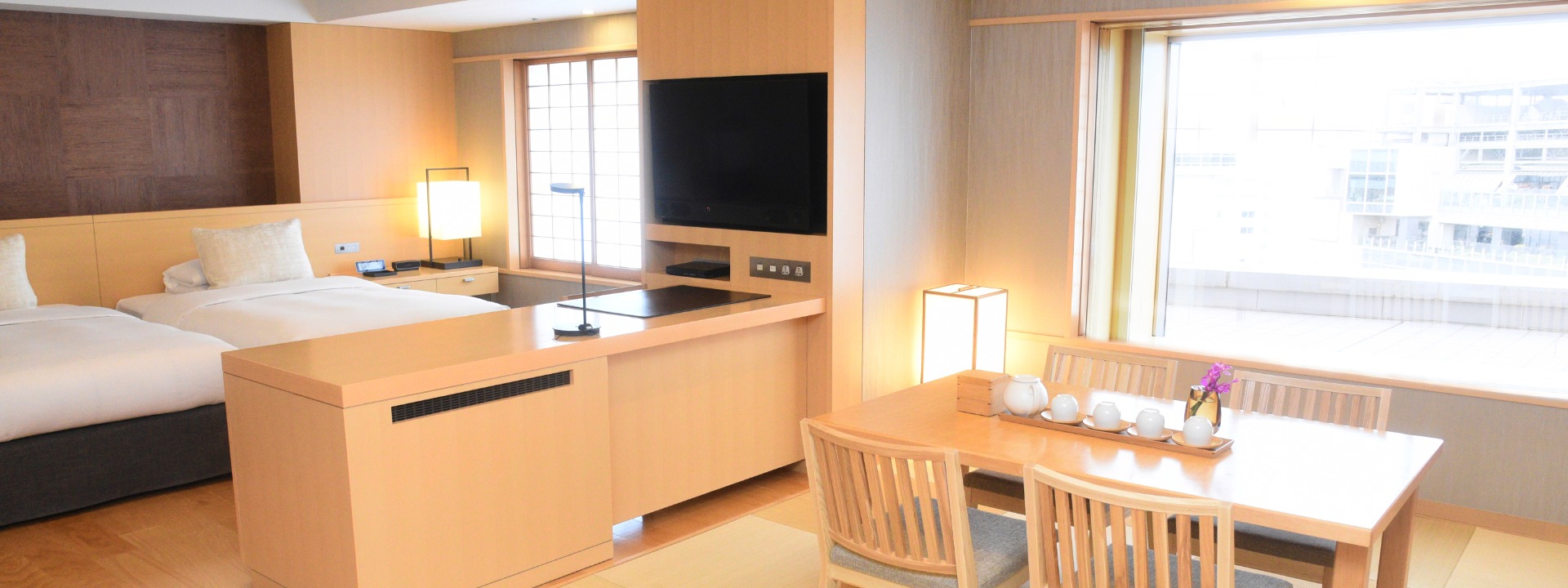 ジャパニーズスイートのバスタブ及び桶は木製となっており、干割れ防止の為に水を張っております。到着時にバスタブ及び桶が濡れている可能性がございますこと、あらかじめご了承ください。