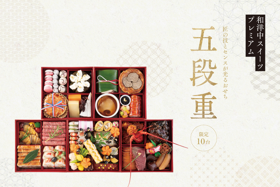 A five-tiered osechi unique to CERULEAN TOWER TOKYU HOTEL is an assortment of 45 items of "Japanese, Western, Chinese, and sweets" that bring together the hotel's total strength with the highest harmony and beauty.