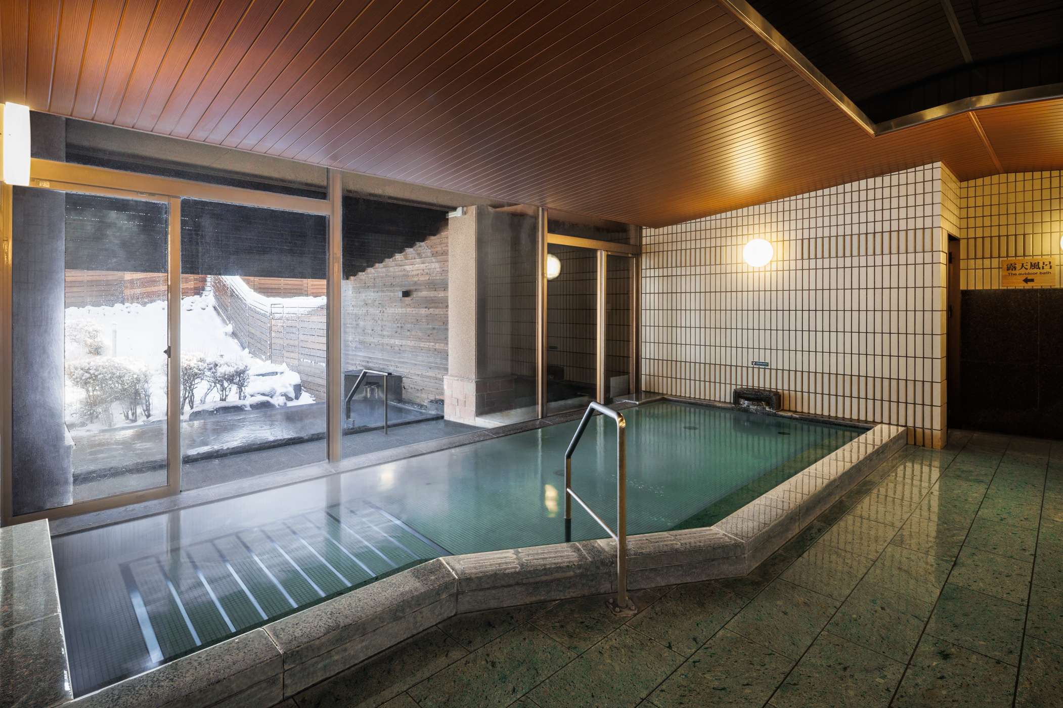 The large public bath with open-air bath is filled with natural Hakuba Happo Onsen (simple alkaline hot spring water).