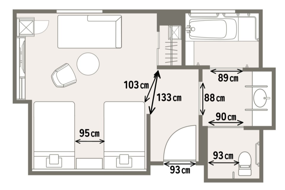 The room layouts shown are just examples. Please note that the size, furniture arrangement, and fixtures vary depending on the room.