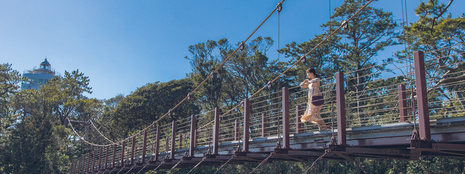 The varied lava rock coast is a 9km hiking trail centered around Kadowaki Lighthouse. You can enjoy magnificent views from the coast, and the suspension bridge along the trail is 48m long and 23m high, making it a thrilling experience. From the observation deck of Kadowaki Lighthouse, located near the suspension bridge, you can get a panoramic view of the Pacific Ocean, including Oshima Island.