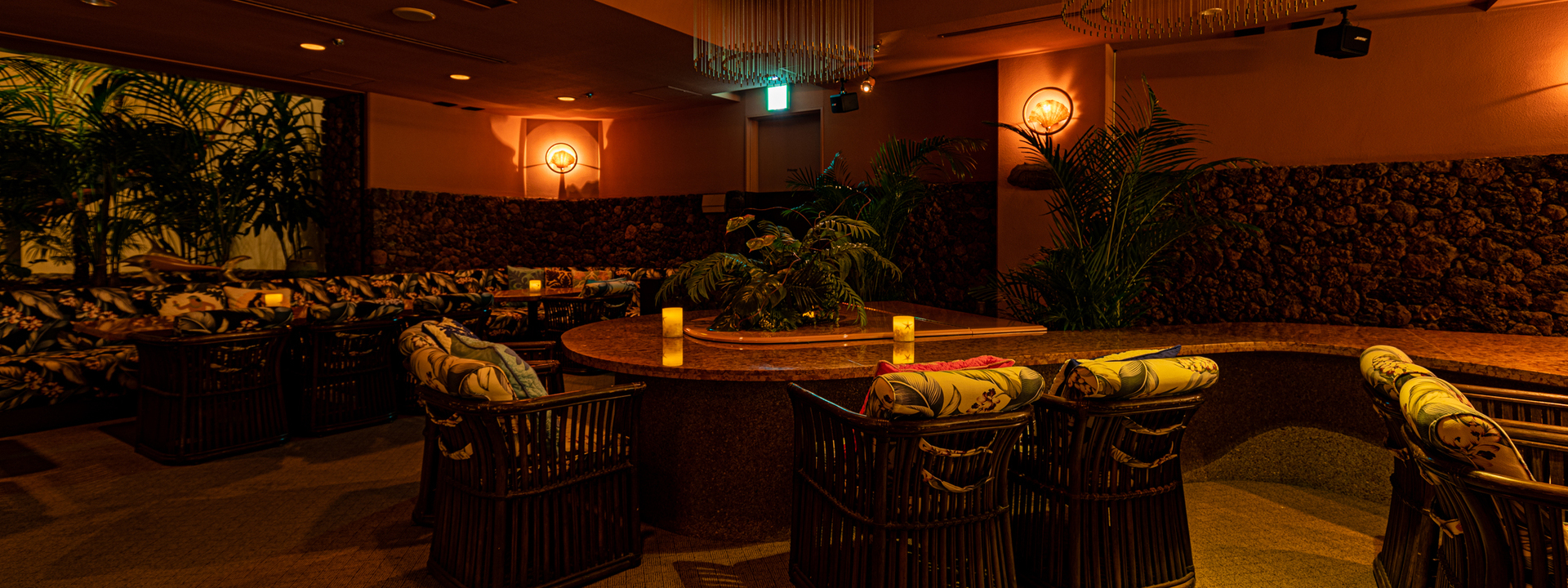 The natural stone wall decorations and marble tables evoke a tropical atmosphere in this bar lounge.