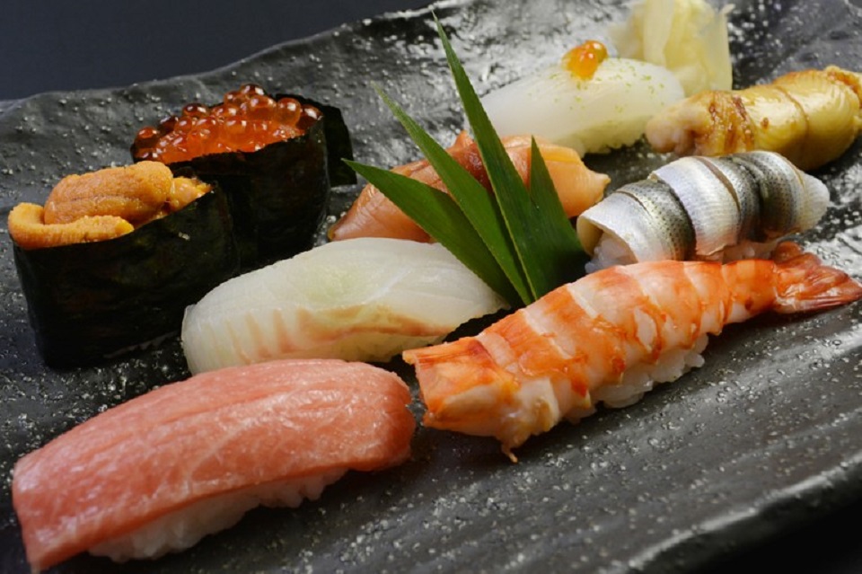 Appetizer, 3 types of sashimi, grilled dish, chawanmushi, 8 pieces of sushi + half a roll, soup, dessert