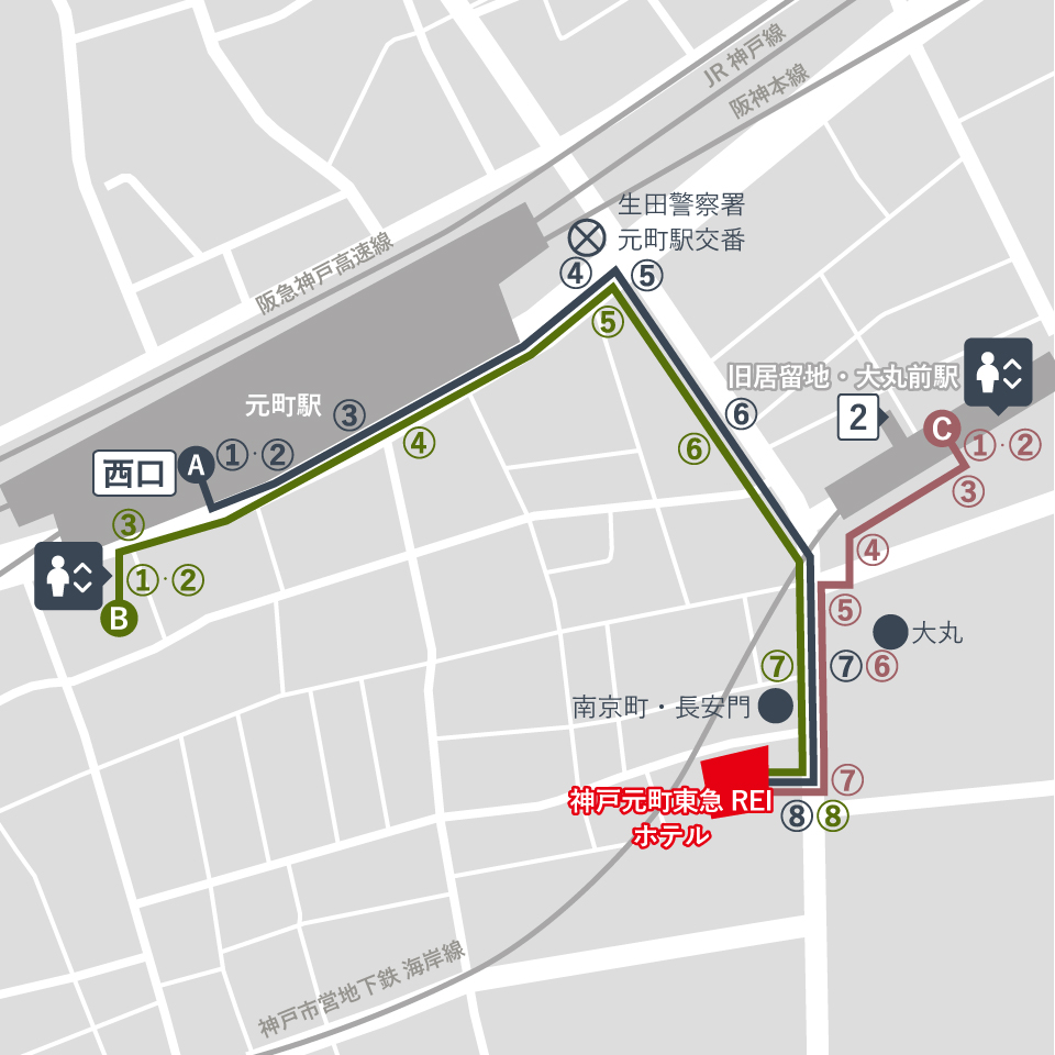 ①Hanshin Railway Motomachi Station West Exit Ticket Gate (Located on the 1st basement floor)