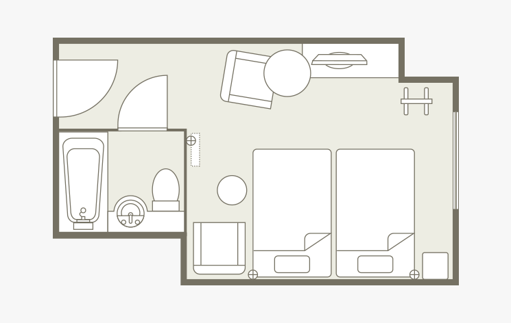 The room layouts shown are just examples. Please note that the size, furniture arrangement, and fixtures vary depending on the room.