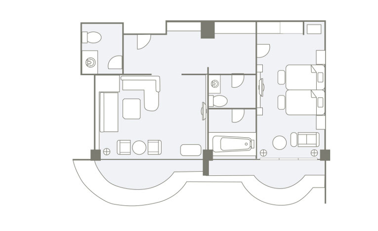 The room layouts shown are just examples. Please note that the size, furniture arrangement, and fixtures vary depending on the room.