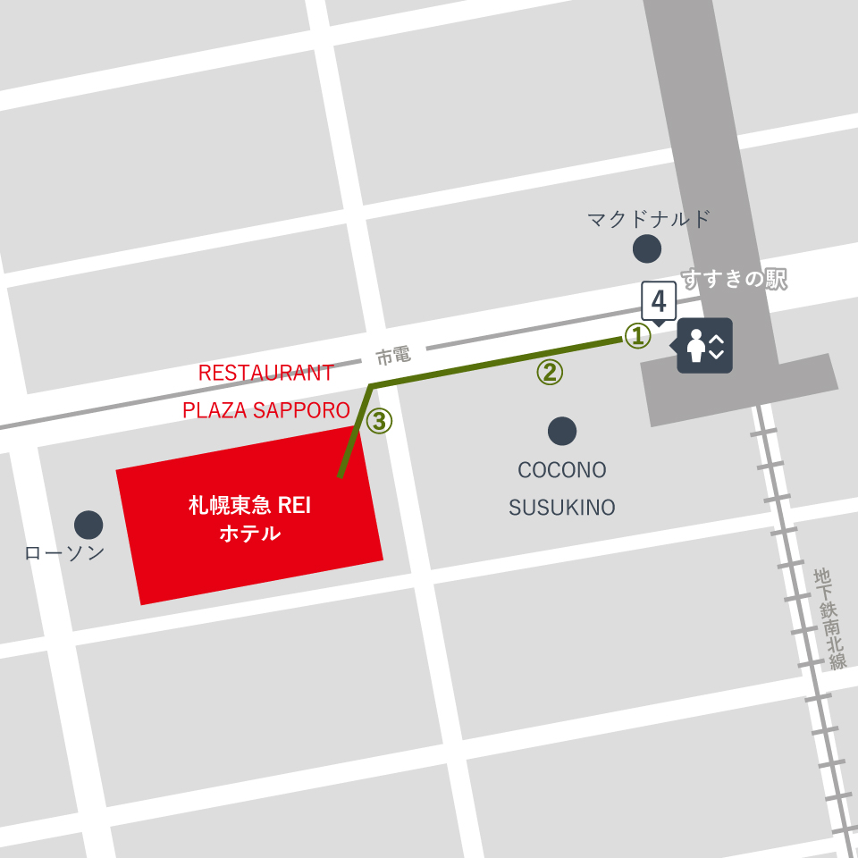 After crossing the first traffic light, you will see the entrance to "RESTAURANT PLAZA SAPPORO" next to the hotel. Go through here to the hotel lobby.