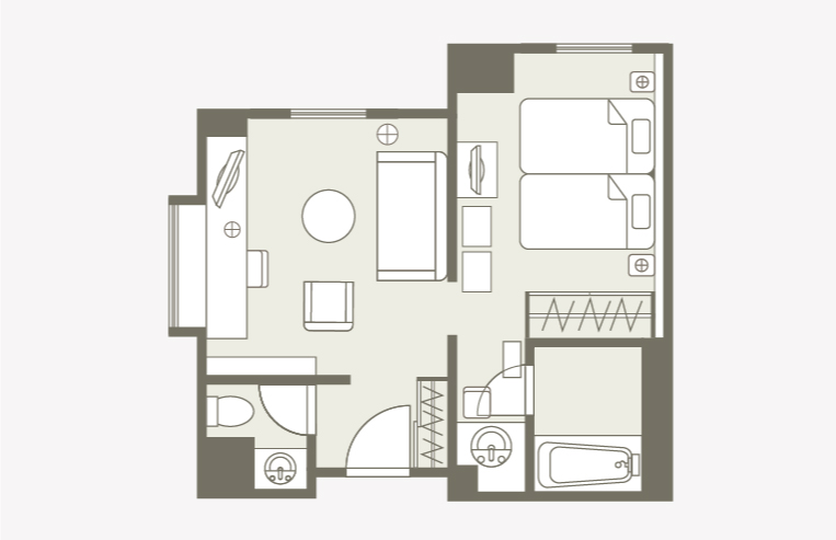The room layouts shown are just examples. Please note that the size, furniture arrangement, and fixtures vary depending on the room.