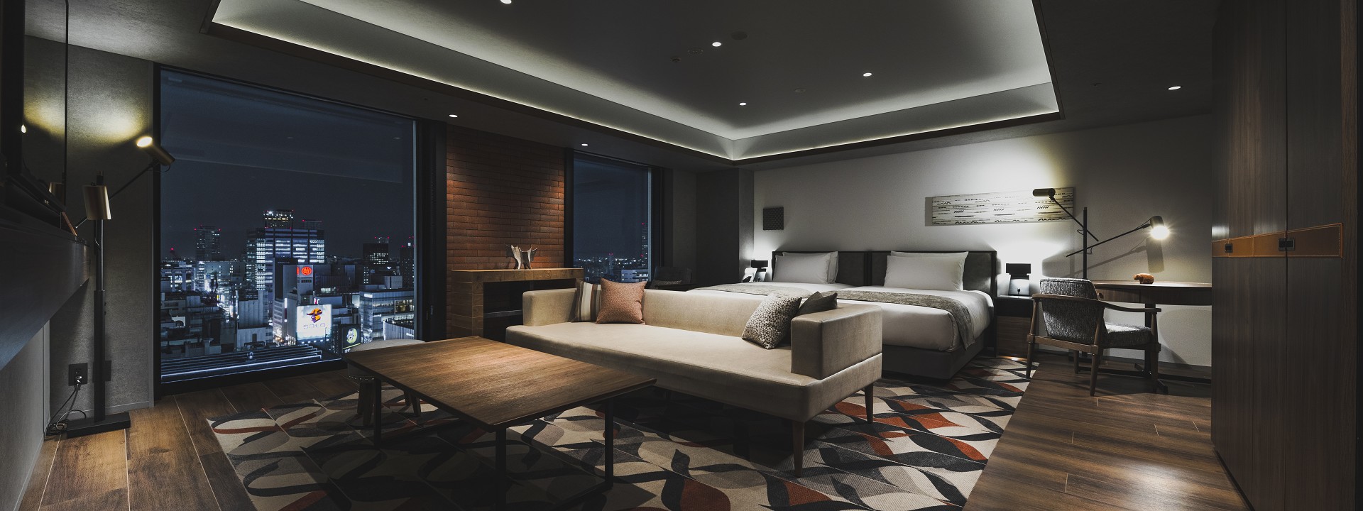 With a spacious sofa and table and a desk space next to the bed, this room's layout ensures a relaxing stay.