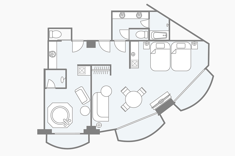 The room layouts shown are just examples. Please note that the size, furniture arrangement, and fixtures vary depending on the room.