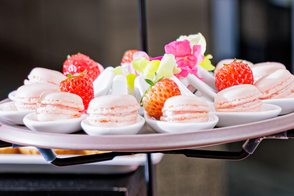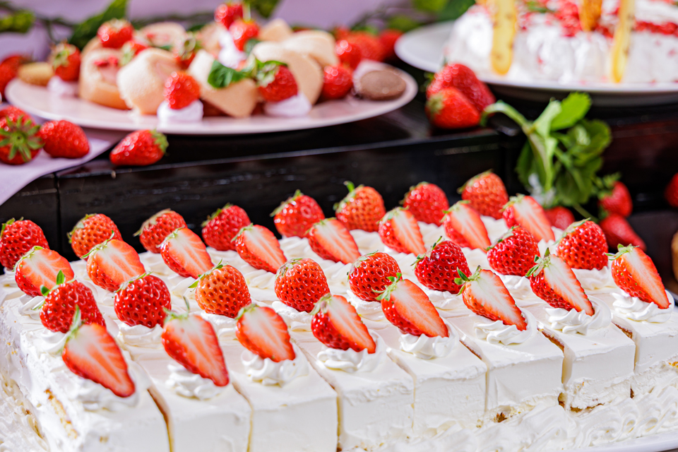 目の前で仕上げる「いちごのクリームスパゲティ」や、「いちごのマカロン」「いちごタルト」など、旬のいちごを使ったスイーツも充実。
