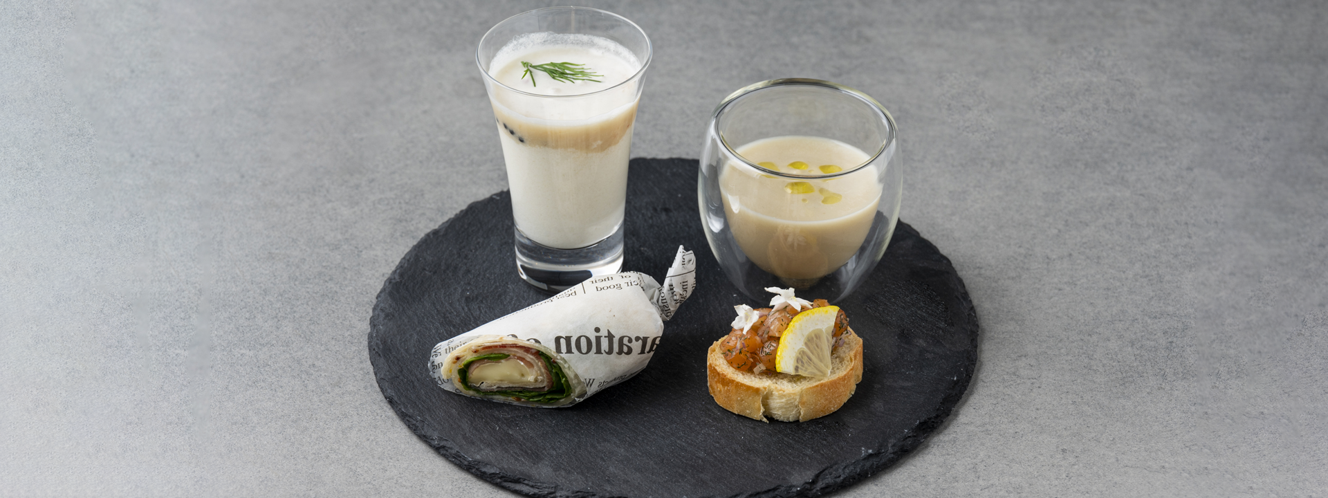 上段には冬の静けさをイメージした白を基調とした世界観、中段下段と下に進むにつれて色彩が増し、春の訪れを感じられるような全12種のセイボリーとデザートをご提供します。