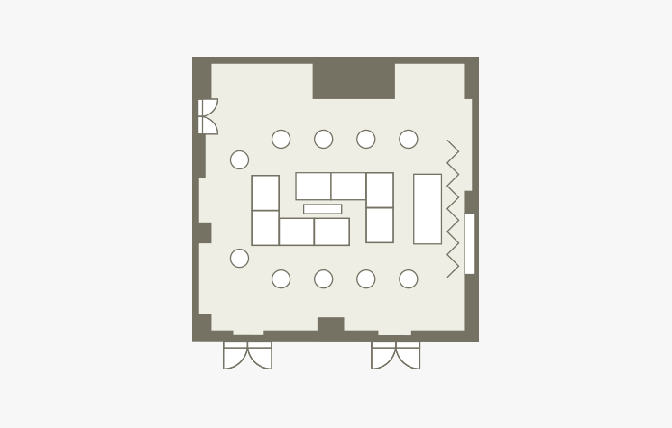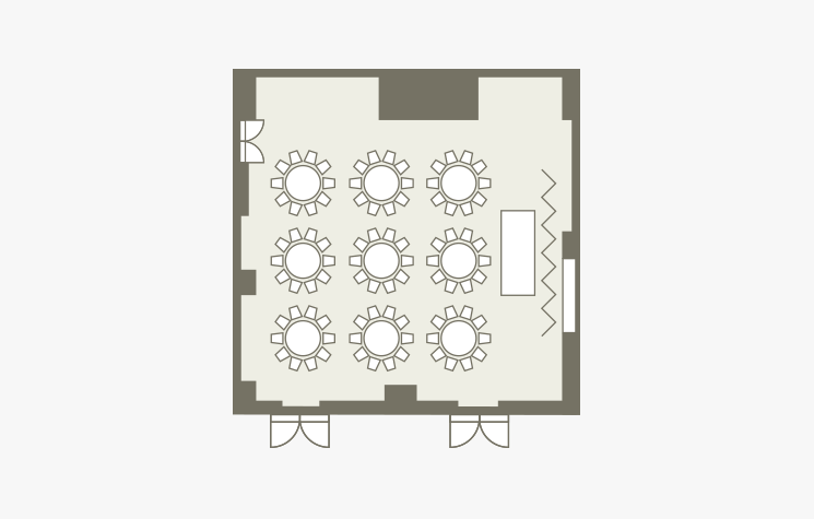立食で60名様(120名様)まで着席で50名様(90名様)までご利用可能。パーティ、会議等に必要な備品を取り揃えております。専属のスタッフがお客様のご意向に合わせた会をサポート。用途によって会場のレイアウトも対応いたします。※カッコ内の数字は最大収容人数になります。ソーシャルディスタンスは確保されておりませんのでご了承くださいませ。