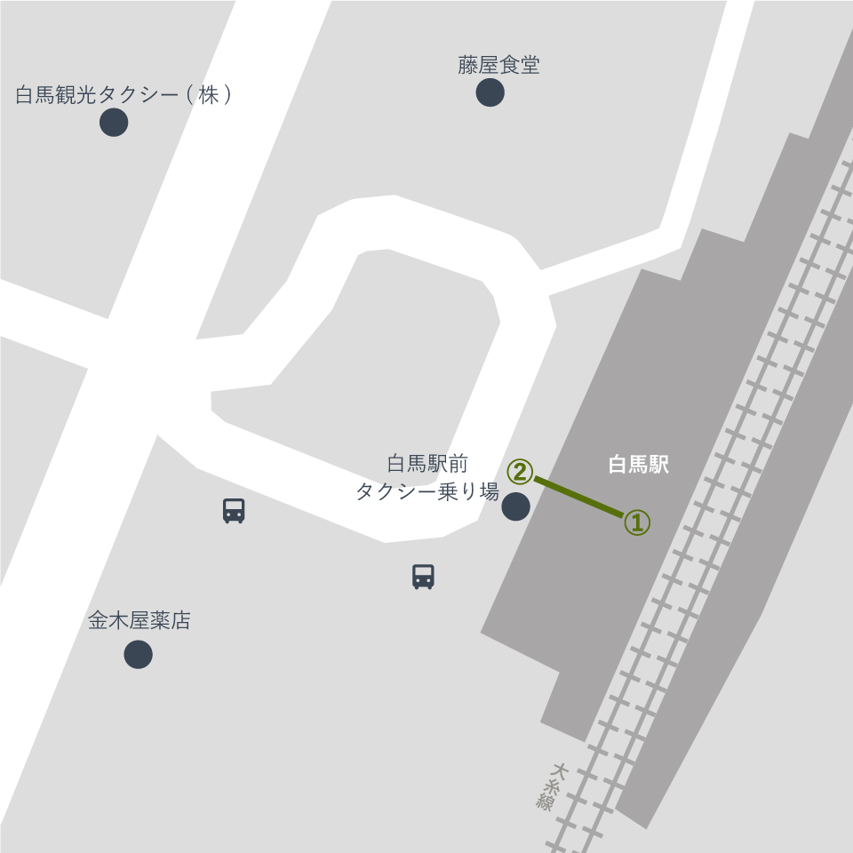 JR白馬駅 改札(一箇所のみ)から出場し、まっすぐお進みください。