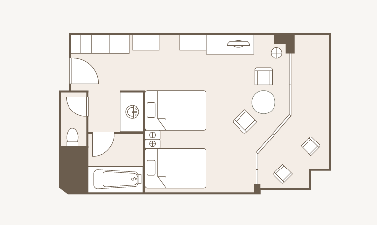 本タイプの客室は、お部屋によって間取りが異なります。写真は一例ですのでご了承ください。