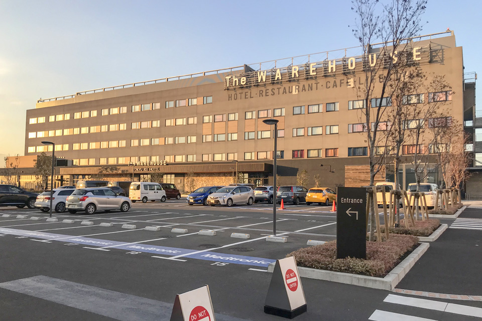 小島新田駅を出て、正面セブンイレブンの右側に進み、突き当たりを左折し、次の交差点まで進みます。国道409号線を渡って右折し、しばらく道なりに進みます。交差点「キングスカイフロント入口」を左折し、モノクロのセブンイレブンを過ぎ、左手「The WAREHOUSE」がホテルになります。