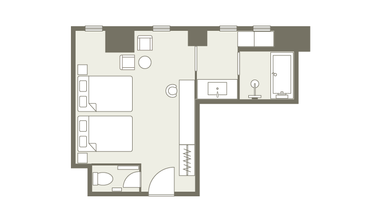 お部屋の間取りはあくまで一例です。面積や家具の配置、備品などはお部屋により異なりますので、あらかじめご了承ください。
