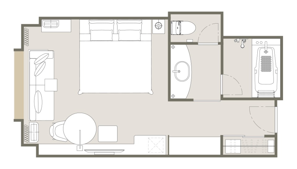 방의 배치는 어디까지나 일례입니다. 면적이나 가구 배치, 비품 등은 객실에 따라 다르므로 미리 양해 바랍니다.