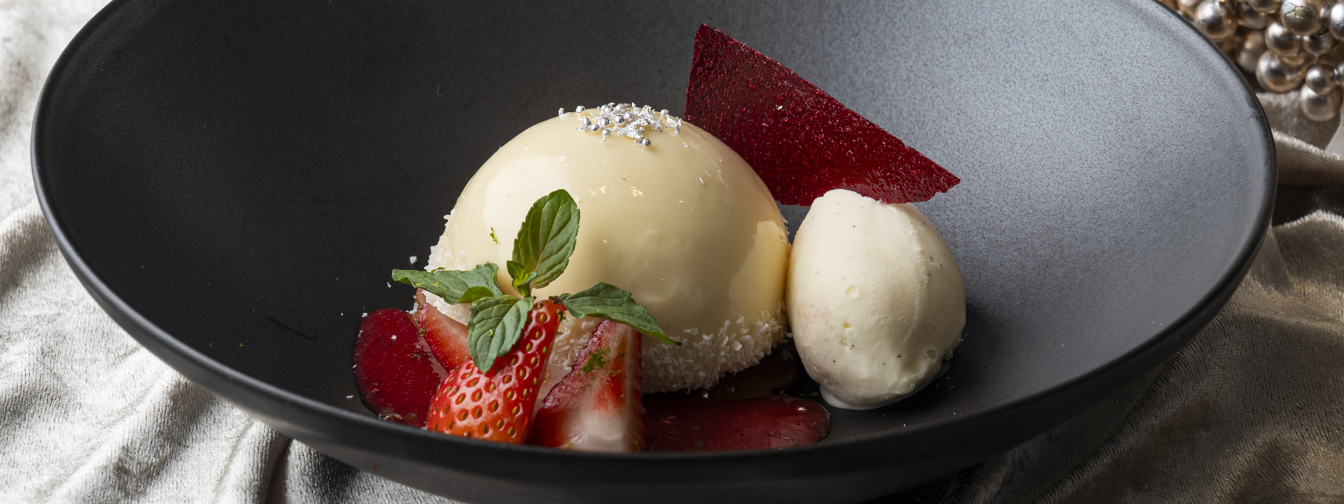 「겨울의 계절」에 어울리는 홀리데이 시즌을 상징하는 빨강과 흰색의 콘트라스트가 빛나는 디저트를 제공합니다.