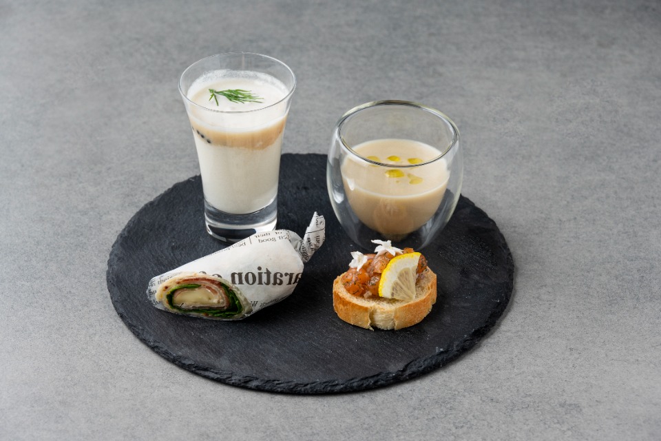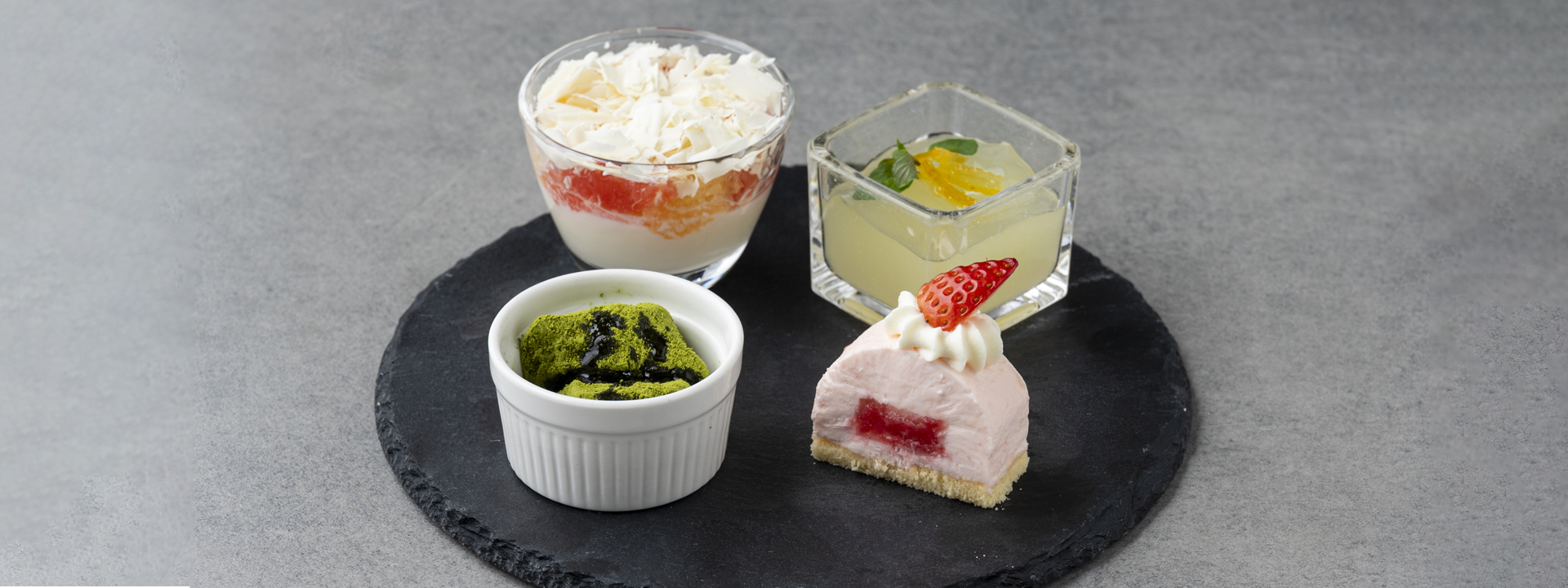 상단에는 겨울의 고요함을 이미지한 흰색을 기조로 한 세계관, 중단 하단과 아래로 진행됨에 따라 색채가 늘어나 봄의 방문을 느낄 수 있는 전 12종의 세이보리와 디저트를 제공합니다.