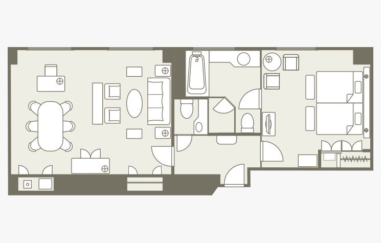 방의 배치는 어디까지나 일례입니다. 면적이나 가구 배치, 비품 등은 객실에 따라 다르므로 미리 양해 바랍니다.