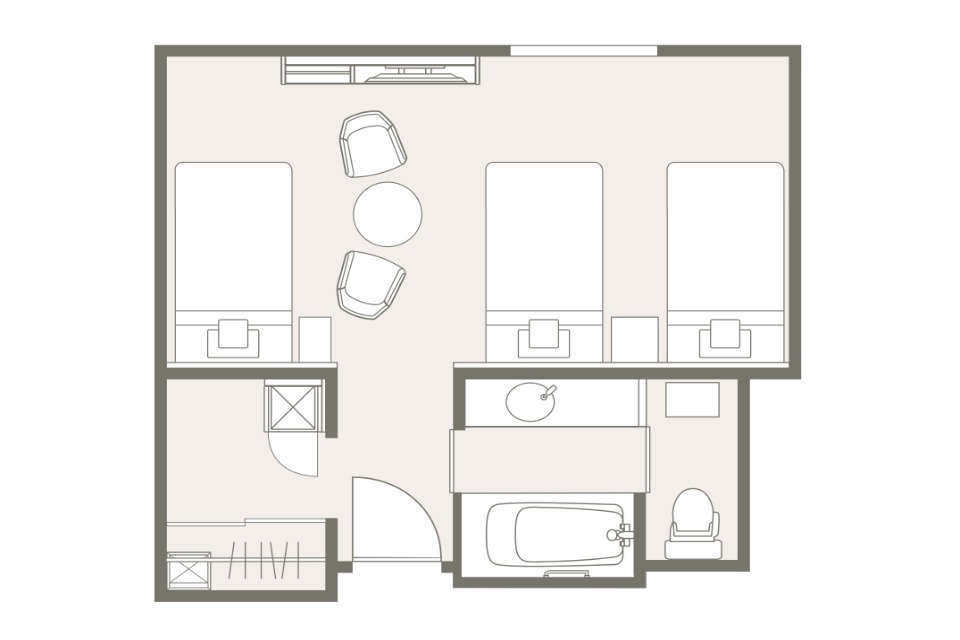 방의 배치는 어디까지나 일례입니다. 면적이나 가구 배치, 비품 등은 객실에 따라 다르므로 미리 양해 바랍니다.