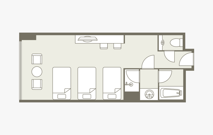 방의 배치는 어디까지나 일례입니다. 면적이나 가구 배치, 비품 등은 객실에 따라 다르므로 미리 양해 바랍니다.