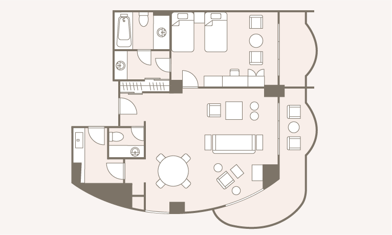 방의 배치는 어디까지나 일례입니다. 면적이나 가구 배치, 비품 등은 객실에 따라 다르므로 미리 양해 바랍니다.