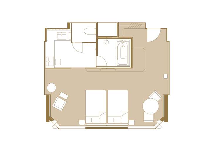 방의 배치는 어디까지나 일례입니다. 면적이나 가구 배치, 비품 등은 객실에 따라 다르므로 미리 양해 바랍니다.