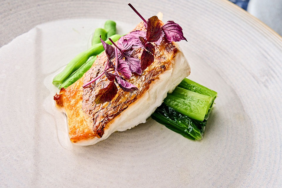 볶은 붉은 도미와 고마츠나 Kanagawa 제철 채소