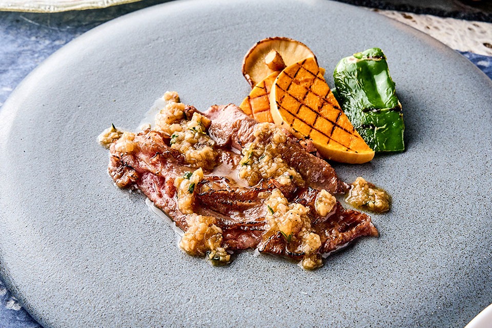 A5 샬롯과 마늘 소스를 곁들인 구운 흑소 Kanagawa 채소와 함께.