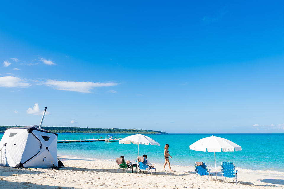 파도 소리를 들으면서 하얀 모래 해변에서 외기욕이 가능합니다.