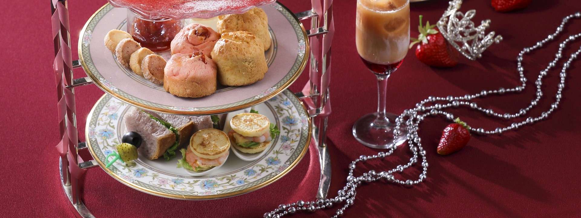 하단:세이보리[새우와 계란의 브리니/나무 딸기 빵·드·미의 샌드(스트로베리·생햄·크림 치즈&락 폴)]