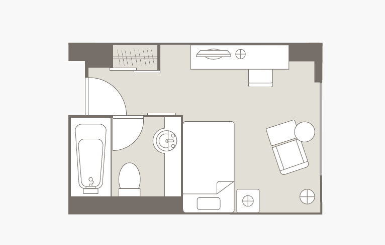 방의 배치는 어디까지나 일례입니다. 면적이나 가구 배치, 비품 등은 객실에 따라 다르므로 미리 양해 바랍니다.