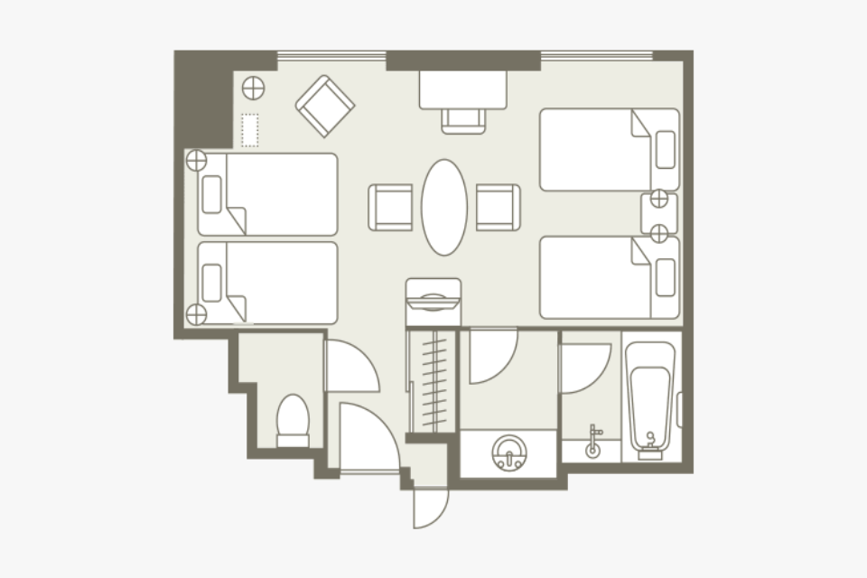 방의 배치는 어디까지나 일례입니다. 면적이나 가구 배치, 비품 등은 객실에 따라 다르므로 미리 양해 바랍니다.
