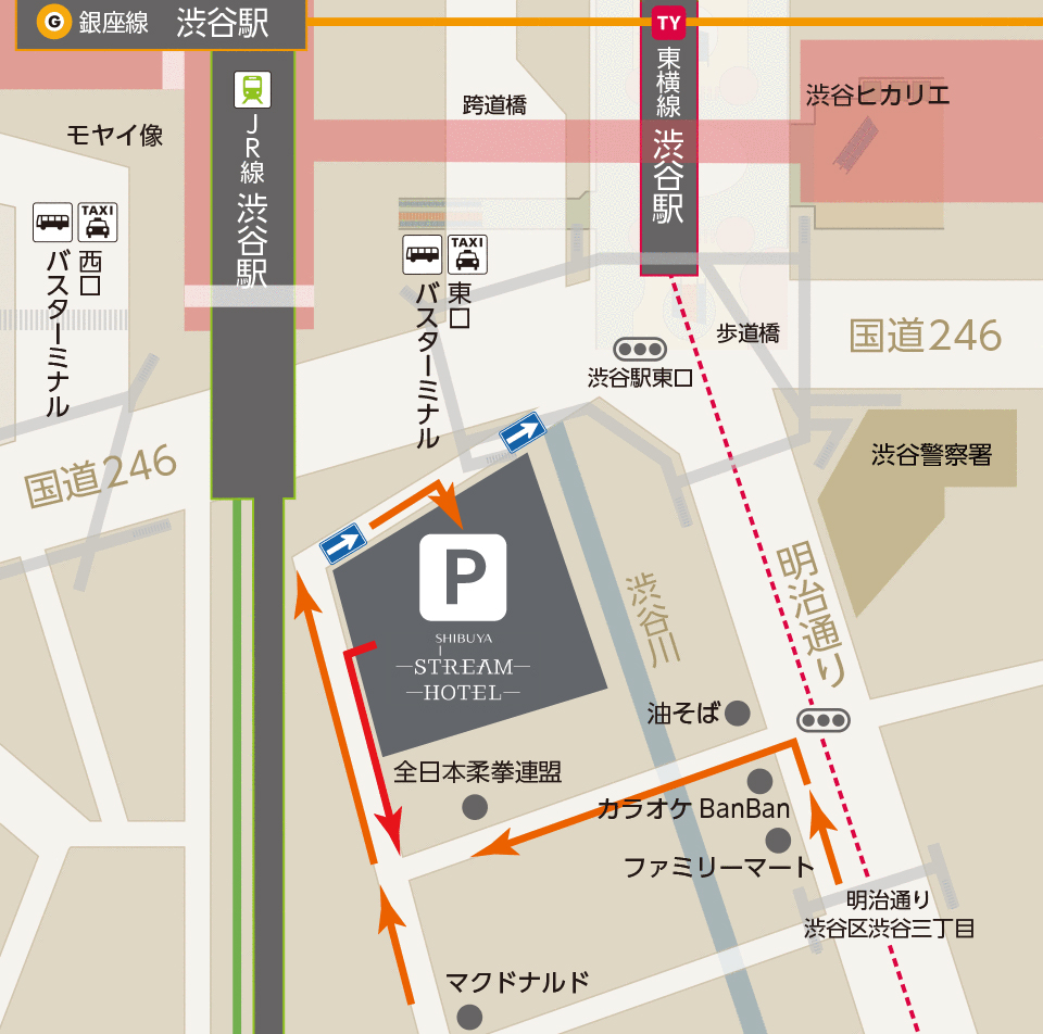 시부야 스트림의 큰 기둥이 보이면, 오른쪽 방향으로 빠집니다.