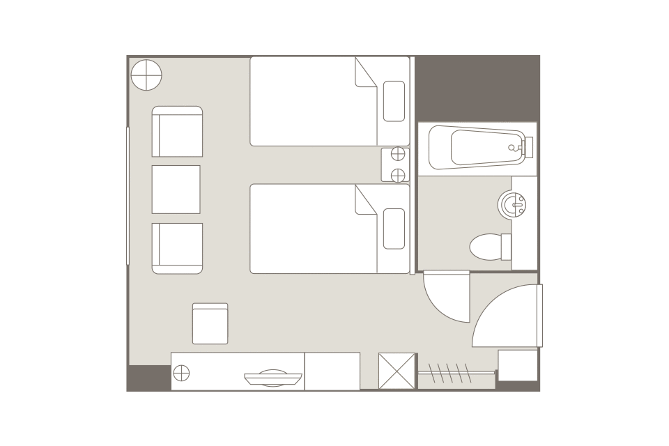 방의 배치는 어디까지나 일례입니다. 면적이나 가구 배치, 비품 등은 객실에 따라 다르므로 미리 양해 바랍니다.