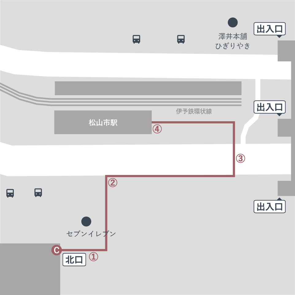 伊予鉄道「松山市駅」北改札口から出ましたら、左手にお進みください。