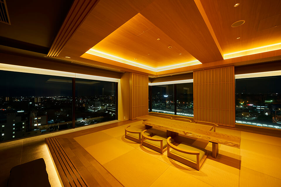 畳に布団を敷いてお休みいただくタイプです。最大6名様までご利用いただけます。角部屋のため、2面に採られた大きな窓からの景色もお楽しみください。
