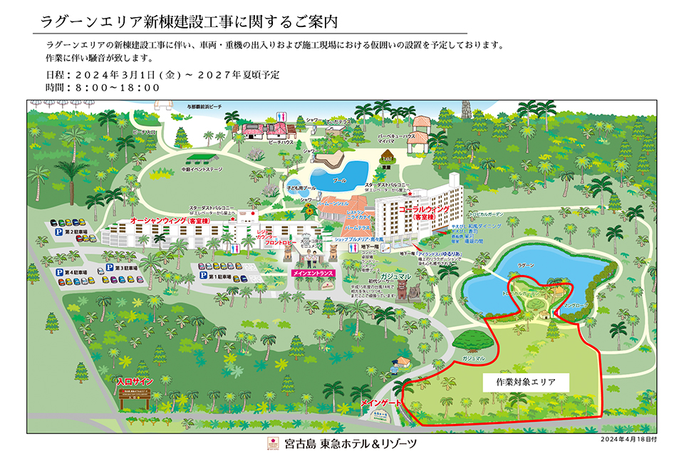 この度、ホテル敷地内ラグーンエリアにおいて、新棟建設工事を実施することとなりました。2024年3月1日より準備工事を、2024年7月より本体工事を開始しております。作業期間中は車両・重機の出入り及び、作業に伴う騒音が発生致します。安全対策については、案内看板の設置やお客様へのご案内、ご誘導など、万全を期して参ります。