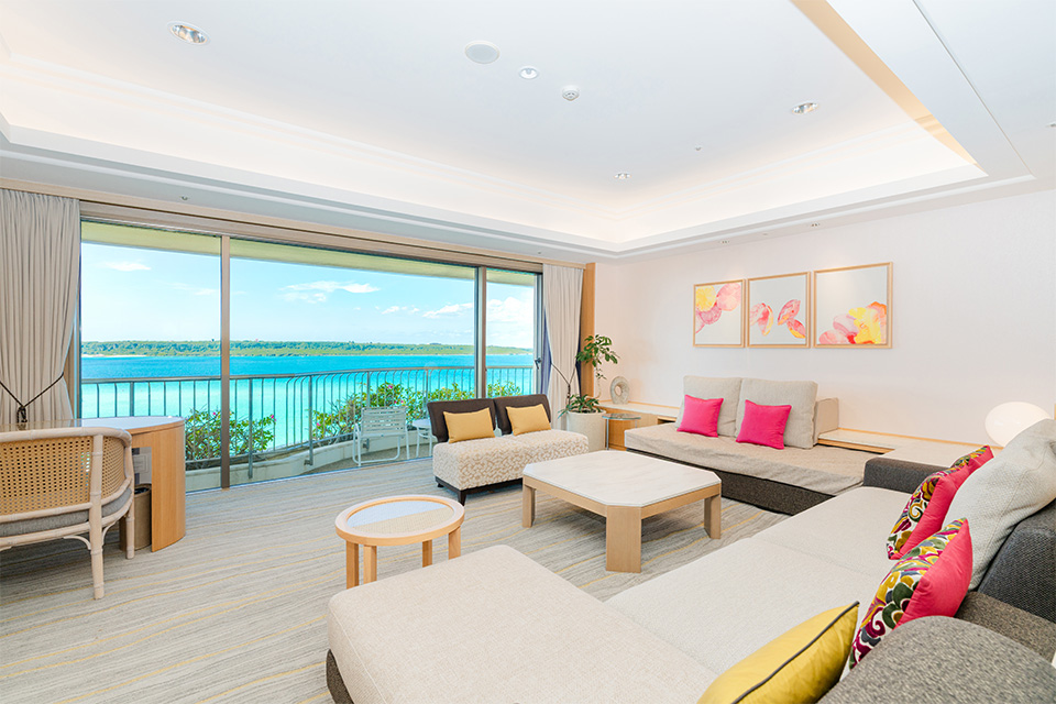 広々としたリビングスペースで寛ぎのひとときを。 最上階から見渡す与那覇前浜ビーチの絶景を眺めながら、贅沢な島時間をお過ごしください。