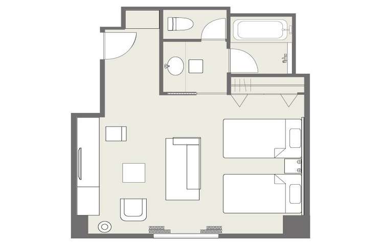 お部屋の間取りはあくまで一例です。面積や家具の配置、備品などはお部屋により異なりますので、あらかじめご了承ください。