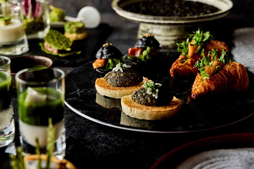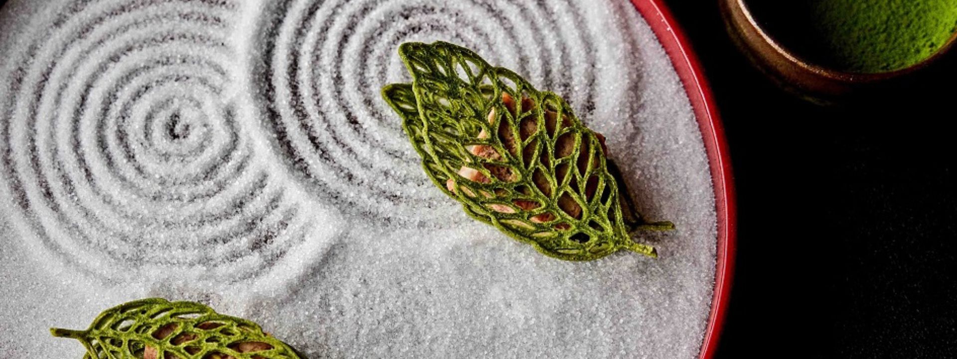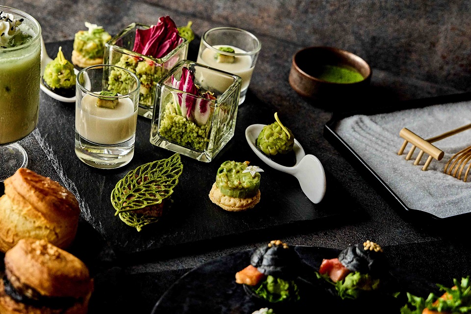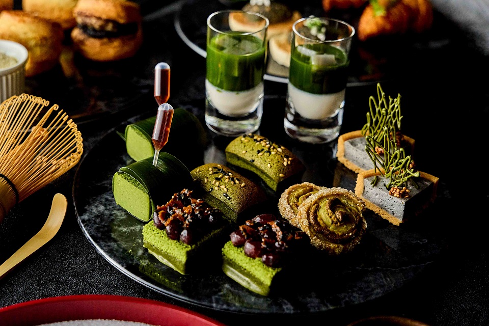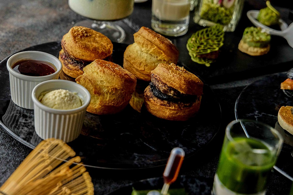 今回のアフタヌーンティーは、抹茶と胡麻を主役に、和の素材が織りなすラインナップをご用意しました。白胡麻と黒胡麻、それぞれの個性を引き出したグラスデザートや、枯山水を思わせる意匠を忍ばせた抹茶のケーキなど、素材の重なりや食感のコントラストを楽しめるプティフールが並びます。セイボリーでは、抹茶のほのかな苦みや胡麻のコクをアクセントに、塩味とのバランスや軽やかな口当たりを意識した構成に仕上げました。さらに、黒胡麻ペーストとあずきを重ねたシーズンスコーンには、胡麻の香ばしさを引き立てたみたらし餡を添えて。和のニュアンスを織り込みながら一品ごとに異なる表情を描く、奥行きのある味わいをご堪能いただけます。TWG Teaとともに、落ち着きの中に洗練を感じるアフタヌーンティーをお楽しみください。