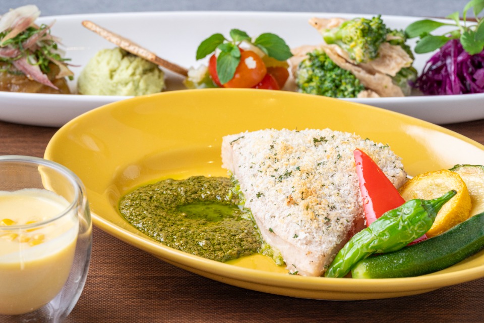 香草面包粉烤剑鱼热那亚酱汁