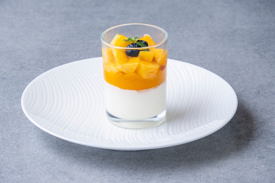 夏季清爽的半熟奶酪、芒果果冻和芒果果肉混合而成的3层Verine。酸味十足的半熟奶酪配上甜味浓郁的芒果,口感清爽。